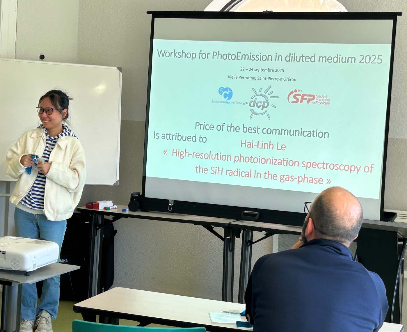 On September 24, Hai Linh LE, a PhD student in the SYSTEMAE team, received this morning the Best Presentation Award at the ‘Photoemission in Diluted Medium 2025’ Workshop, organized by the Physical Chemistry Division of the French Chemical Society (SCF).
