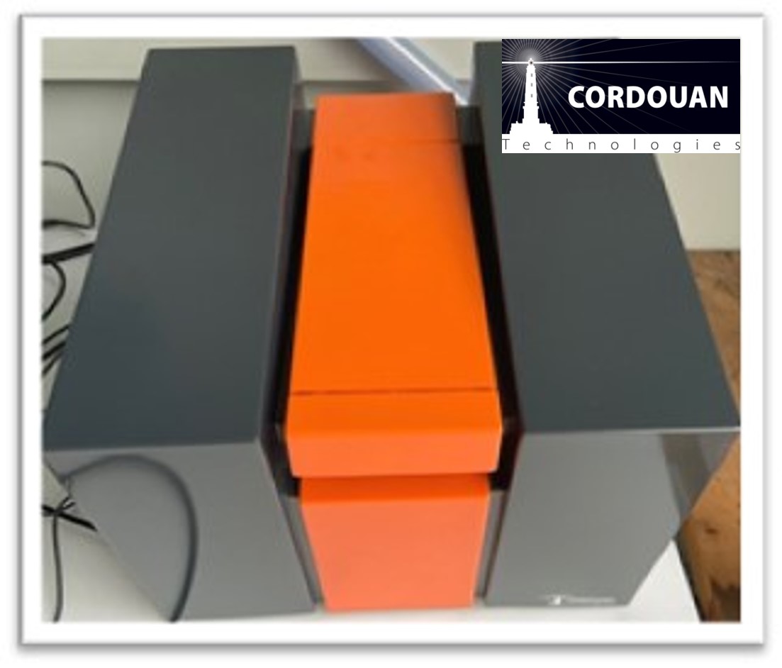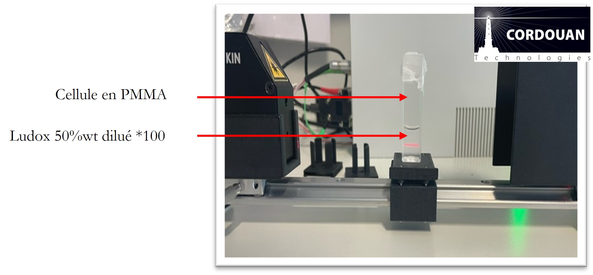 L’appareil de diffusion dynamique de la lumière de chez Cordouan est un appareil simple d’utilisation constitué d’une sonde mobile composée de deux faisceaux laser, d’un porte-échantillon, le tout disposé sur un rail.