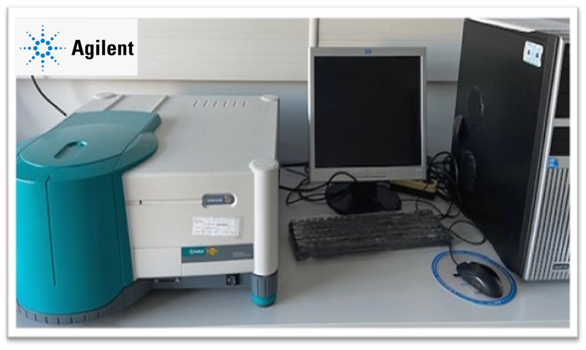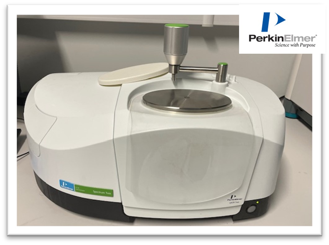 Le spectromètre FTIR-ATR disponible est le spectromètre Perkin Elmer Spectrum Two Fourier Transform Infrared (FTIR) avec le module de réflectance totale atténuée (ATR) pour l’analyse des matériaux. Cet appareil permet d’obtenir le spectre infrarouge des échantillons analysés sous forme solide ou liquide.
