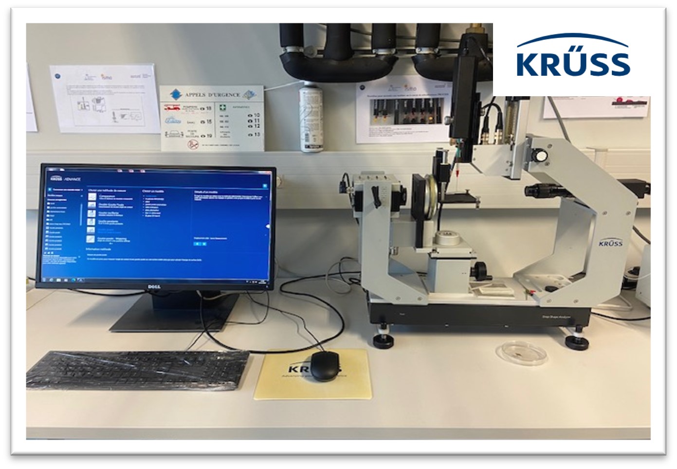 Le laboratoire dispose du goniomètre DSA 30S de Krüss qui permet d’effectuer des mesures d’angle de contact et d’énergie de surface à partir de gouttes déposées sur une surface.